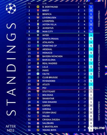 欧冠次轮第二个比赛日爆冷,皇马、拜仁等豪门落马,里尔、维拉等爆冷取胜。马竞0-4惨败本菲卡,利物浦、尤文图斯等豪强保住颜面。积分榜上,多特、本菲卡、尤文、维拉等7队两连胜,拜仁、皇马等1胜1负,米兰、莱比锡、赫罗纳等8队两连败。