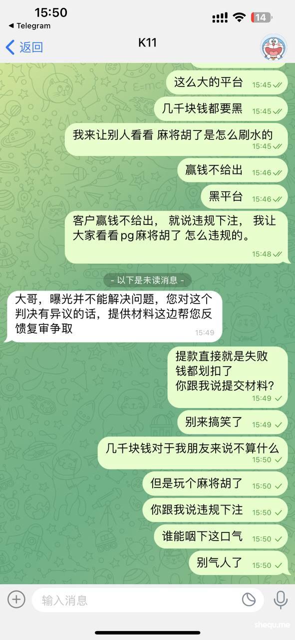 前两天在米兰体育开了代理线, 喊身边朋友去玩, 今天朋友首存2000,赢了3500然后进行提款, 被客服告知违规操作 违规套利 违规下注。我就搞不懂了 pg麻将胡了 怎么个违规套利。违规下注法, 真的是天大的笑话, 电子有违规下注这么一说。 希望大家可以好好的审视一下自己做代理的平台,别到时候辛苦一个月佣金拿不到手, 我这几千块钱都是小钱, 大家好好审视一下自己合作的平台, 这种垃圾平台真的没有必要在合作下去, 新用户 存款2000,赢3500都不给出款。 这种平台真的是格局太小。难道只能输,不能赢吗, 我希望大家还在玩的多多注意。