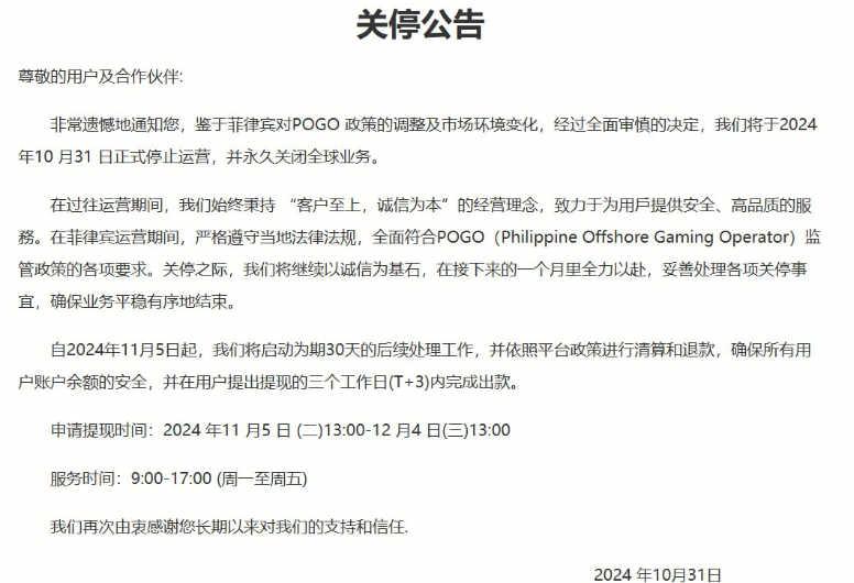 非常遗憾地通知您,鉴于菲律宾对POGO 政策的调整及市场环境变化,经过全面审慎的决定,我们将于2024 年10 月31 日正式停止运营,并永久关闭全球业务。